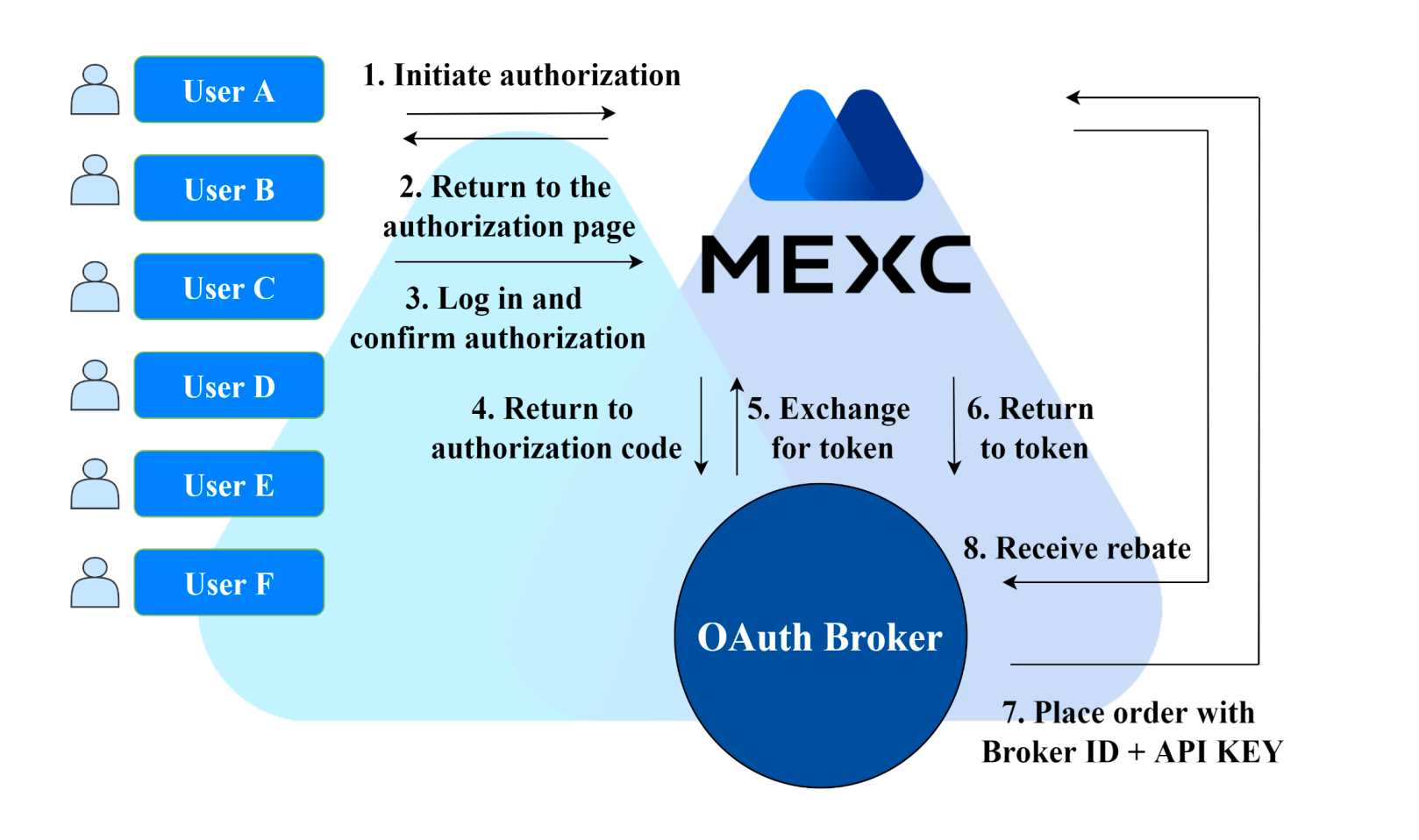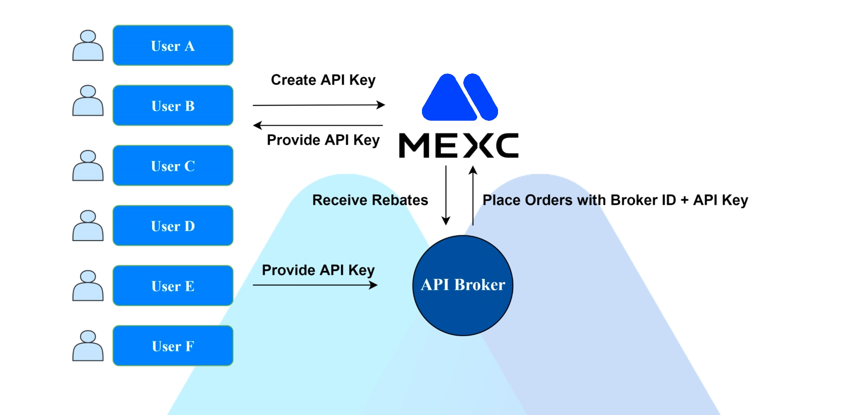 The user signs up at MEXC, applies for API Key in MEXC, and provides it to the broker.