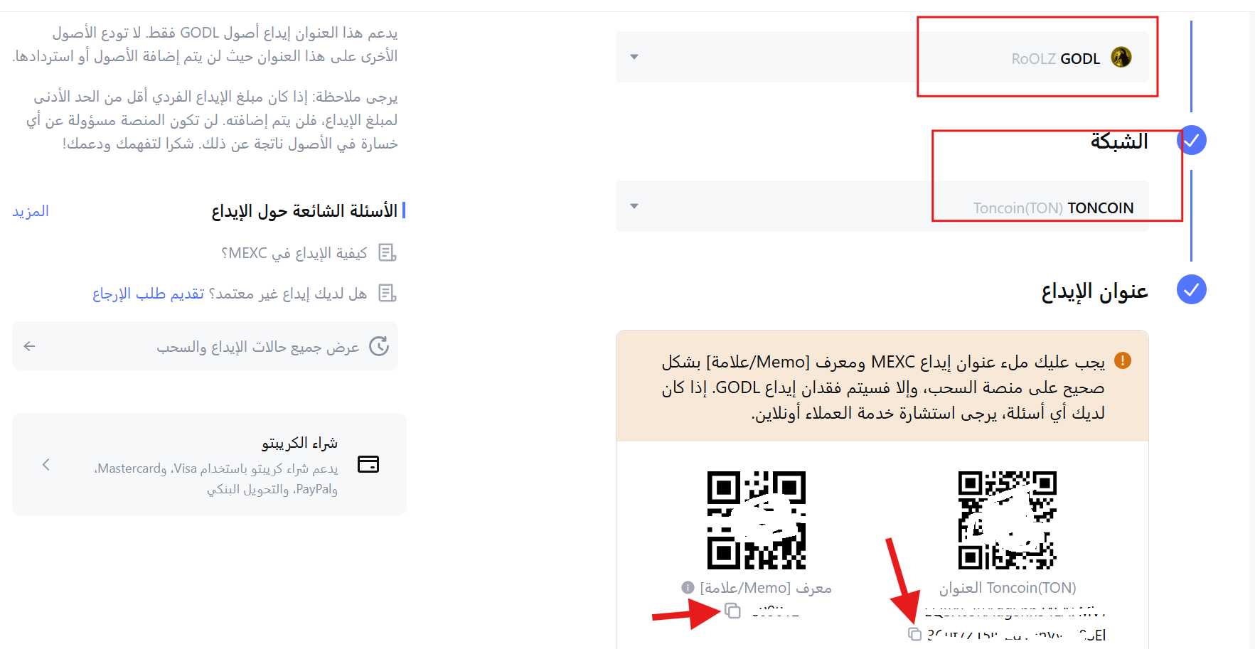 - انتقل إلى [المحافظ] > [الإيداع] > [اختر الكريبتو - GODL] > [الشبكة - TONCOIN] > انسخ عنوان الإيداع وMemo.