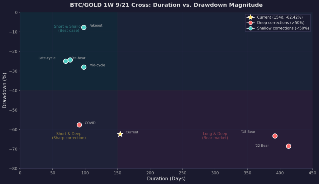 Selon les recherches de Delphi Digital, le ratio BTC/Gold a chuté de plus de 60 % depuis son dernier croisement baissier, https://members.delphidigital.io/feed/bitcoin-vs-gold-positioning-for-the-next-relative-cycle?utm_source=emailoctopus&utm_medium=email&utm_campaign=Delphi+Newsletter+Edition+-4,+9th+Mar,2026, le ratio BTC/or a chuté de plus de 60 % depuis son dernier croisement baissier, ce qui le place parmi les plus fortes baisses relatives de son histoire. Seuls les marchés baissiers de 2018 et de 2022 ont connu des reculs plus importants. Ce qui compte n'est pas seulement l'ampleur, mais aussi la vitesse. Cette baisse s'est produite en environ cinq mois, alors que les cycles précédents ont mis près d'un an pour atteindre des extrêmes similaires. Historiquement, des mouvements aussi compressés ont tendance à s'épuiser plus rapidement.