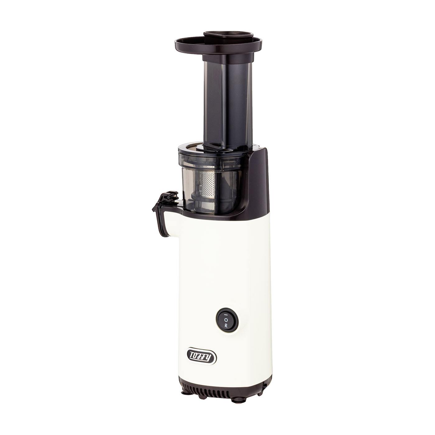 ラドンナの「Toffy ミニスロージューサー K-BD4」は、日本のメーカーが手がけるコンパクトなスロージューサー。コンパクトさやインテリアになじむレトロな見た目が特徴です。ジュースの仕上がりでは、特にオレンジで94.7%が平ふるいでこせたため滑らかで飲みやすいジュースが作れました。一方で、小松菜やにんじんではやや繊維感が残る仕上がりとなり、滑らかさを重視する人には物足りなく感じられるでしょう。搾汁率はおおむね良好で、オレンジは64.5%、小松菜は70.0%、にんじんは31.3%と、やわらかい果物や葉物野菜を中心に使う場合には効率よく搾れました。手入れのしやすさも、8個のパーツはすべて分解可能・丸洗いに対応しており、付属の洗浄ブラシを使えば、日常的なメンテナンスも比較的しやすい構造です。一方で、圧搾時間はにんじんで3分46秒、オレンジで8分26秒、小松菜で7分49秒とにんじん以外は長めの結果に。さらに、食材はその都度投入する必要があり、調理中は常に付きっきりでの作業が求められます。稼動直後の音も70.8dBと大きめで、夜間や早朝など静かな時間帯の使用にはやや不向きです。やわらかい食材での使いやすさや手入れのしやすさには魅力がありますが、圧搾時間の長さや稼動音の大きさ、調理中の手間など気になる点も多い本商品。効率や使いやすさを重視する人は、ほかの商品を選択肢に入れるほうがよいでしょう。