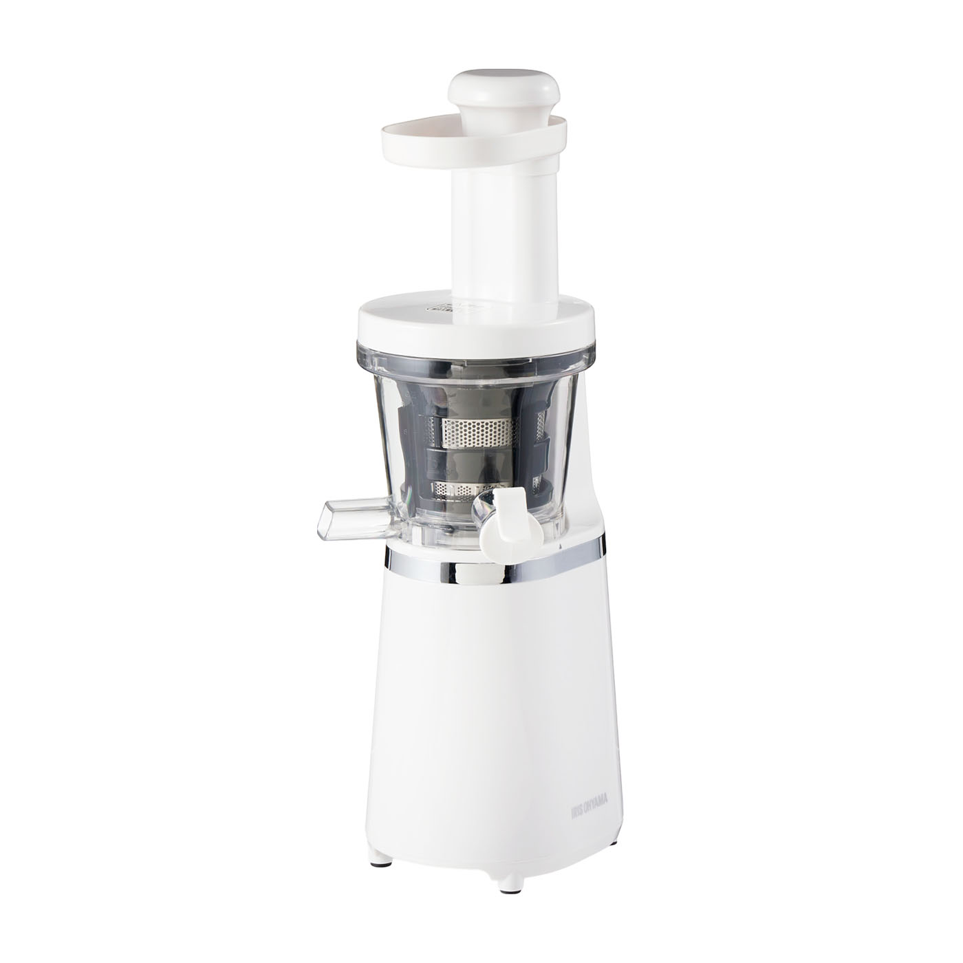 アイリスオーヤマの「スロージューサー ISJ-56」は、日本の総合家電メーカー・アイリスオーヤマが展開するモデルで、健康志向の家庭向けに設計されたスロージューサーです。スムージーやジュースだけでなく、3種類のフィルターを使い分けることで、フローズンドリンクやソースづくりなど幅広い用途に対応できます。ジュースの仕上がりは、にんじんで94.3%、オレンジで95.2%、小松菜で92.0%が液体としてこせた結果に。非常に滑らかで繊維感も少なく、飲みやすいジュースに仕上がりました。栄養面ではオレンジのビタミンC残存量が高かったため、栄養をしっかり摂りたい人にもおすすめです。搾汁率も全体的に高めで、硬めの食材でもしっかり果汁を搾れる点が魅力。圧搾時間もどの食材でも短く、スムーズに搾汁できました。手入れのしやすさでは、11個のパーツを分解して丸洗いでき、洗浄ブラシも付属。ただし、パッキンは一部取り外せず、カス排出口も開かない構造なので、細かい部分の洗浄にはやや手間がかかるでしょう。調理時は食材をその都度投入する必要があるため、こまめな操作が求められます。圧搾自体はスムーズですが、付きっきりで作業する必要があるため、忙しい時間帯にはやや手間に感じるでしょう。稼動直後の稼動音は71.4dBと大きめで、テレビや会話の邪魔になるほどではないものの、静かな環境での使用には注意が必要です。ジュースの滑らかさや搾汁率の高さ、圧搾時間の短さなど、仕上がりのよさを重視する人におすすめの商品。こまめな操作や稼動音の大きさが気にならない人であれば、日常的に活躍する1台でしょう。