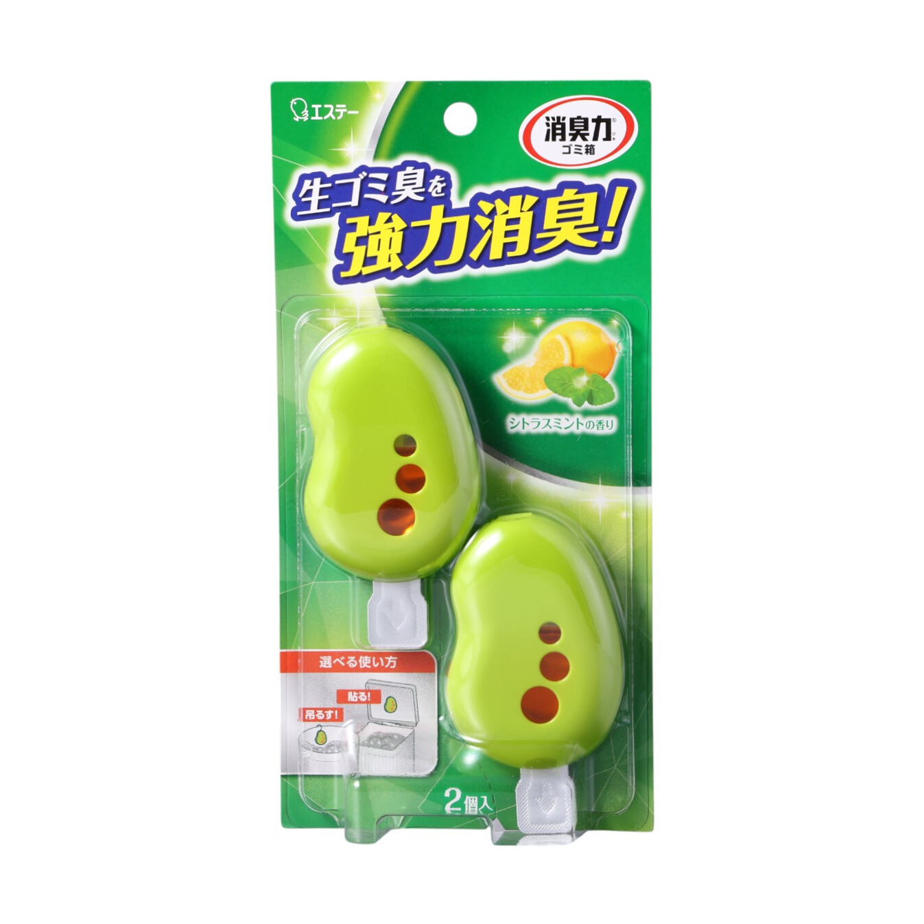 エステーは、主に家庭向け消臭剤を販売している日本の日用雑貨メーカー。なかでも「消臭力 ゴミ箱用」は、シトラスミントの香りのする消臭剤です。溶剤と香料により生ゴミ臭を強力に消臭。ゴミ箱の蓋の裏に貼るか、引っ掛けて使える両用タイプで、使用期間目安は約1ヶ月間を謳っています。