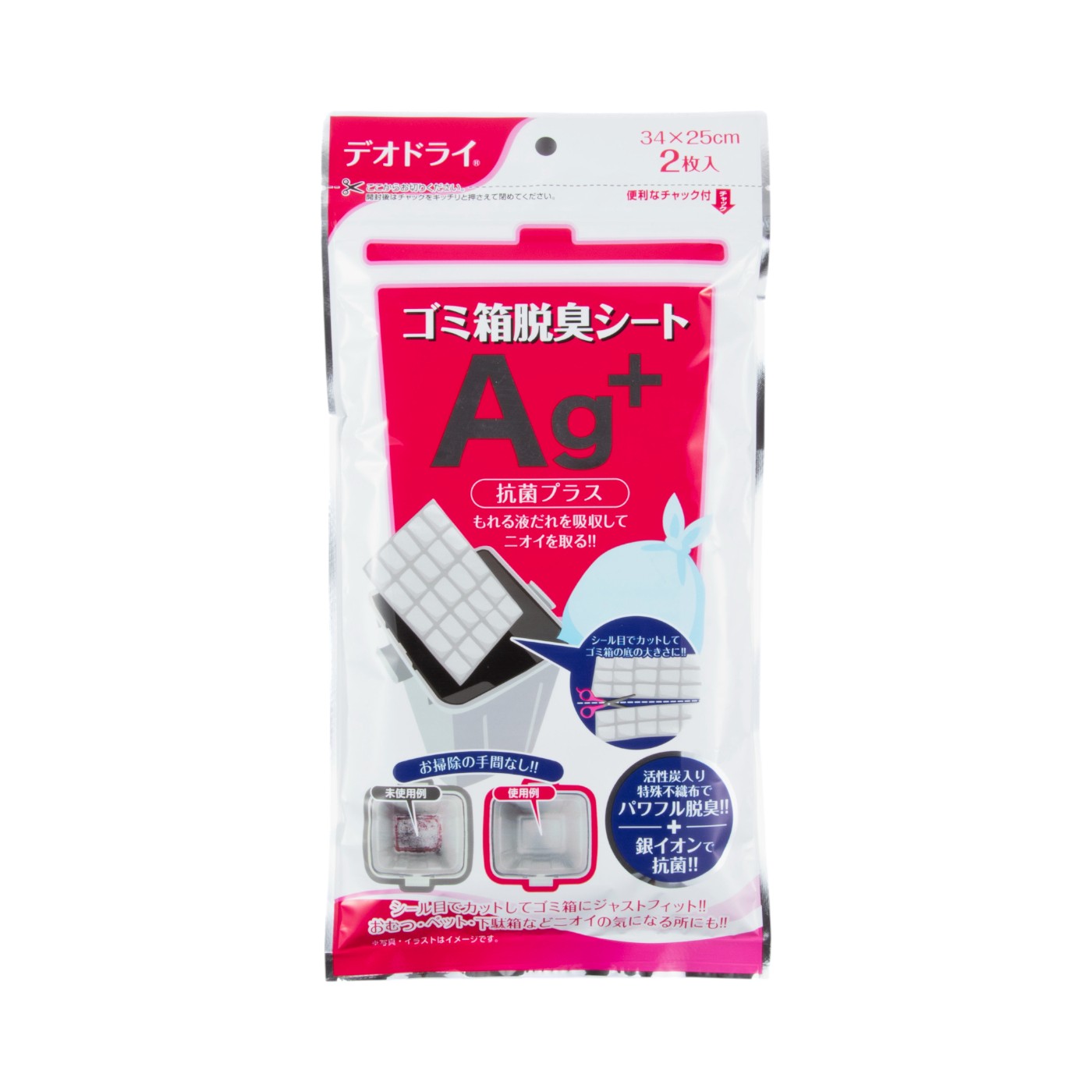 豊田化工はシリカゲル製造メーカーで、「デオドライ ゴミ箱脱臭シートAg+」は銀イオンで消臭すると謳っています。活性炭入り特殊不織布と活性炭による脱臭機能に加え、シリカゲルで液だれを吸収し、銀イオンで抗菌作用も発揮。使用期間目安は約1ヶ月です。