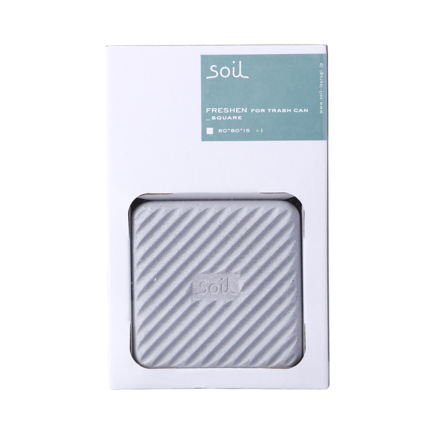 soilの「フレッシェン フォー トラッシュカン」は、珪藻土と炭、高い消臭力をもつリサイクルアッシュでつくられた調湿脱臭剤。嫌なニオイだけでなく湿気を吸い取り、ニオイを軽減します。蓋の裏に貼り付けて使用し、定期的に風通しの良い場所に置くことで脱臭力が回復するため、約6ヶ月の長期使用が可能と謳っています。