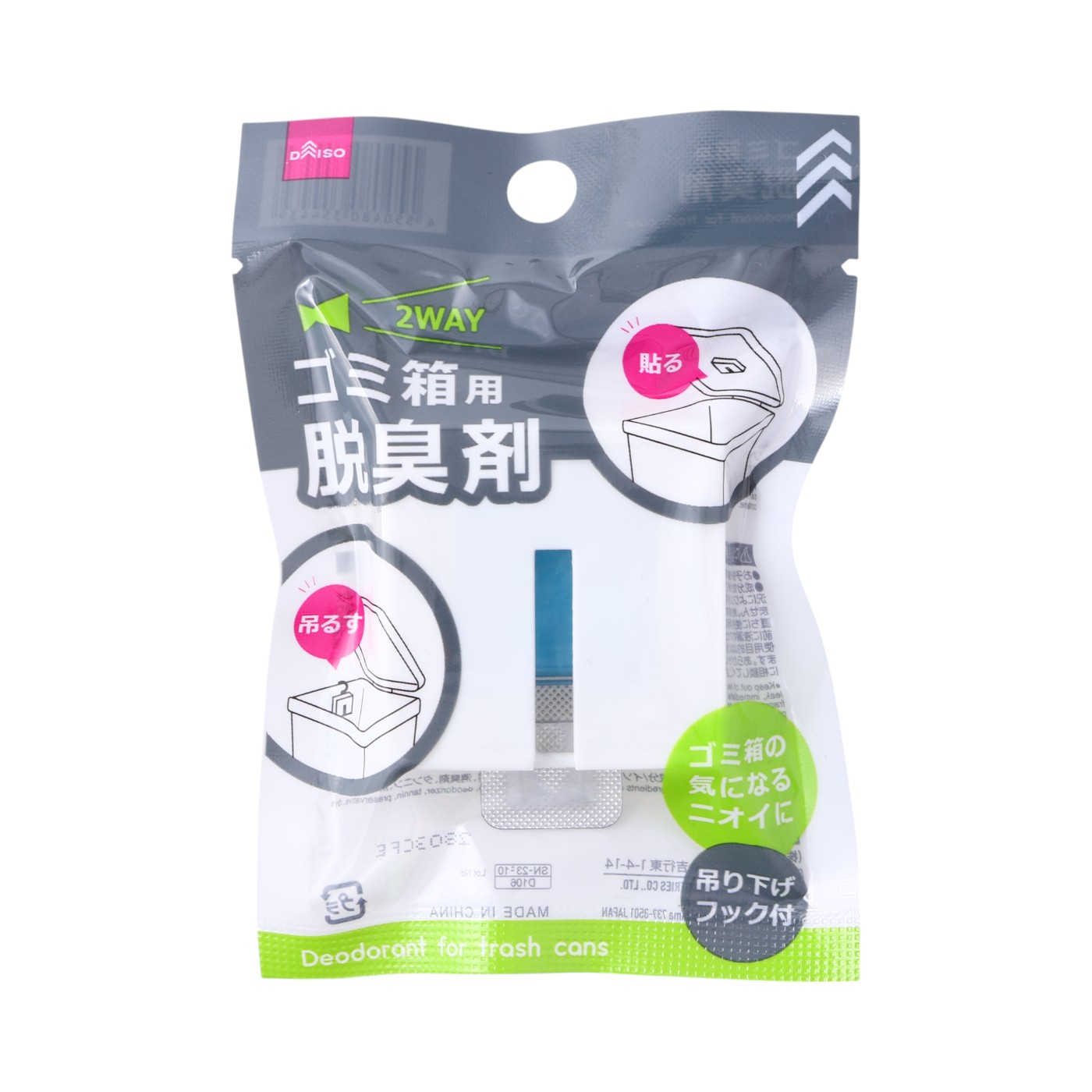 大創産業の「ダイソー ゴミ箱用脱臭剤」は低価格で試せるのが魅力。蓋付きと蓋なし両方のゴミ箱に対応し、蓋の裏に貼りつけることも、引っ掛けて使うこともできます。
