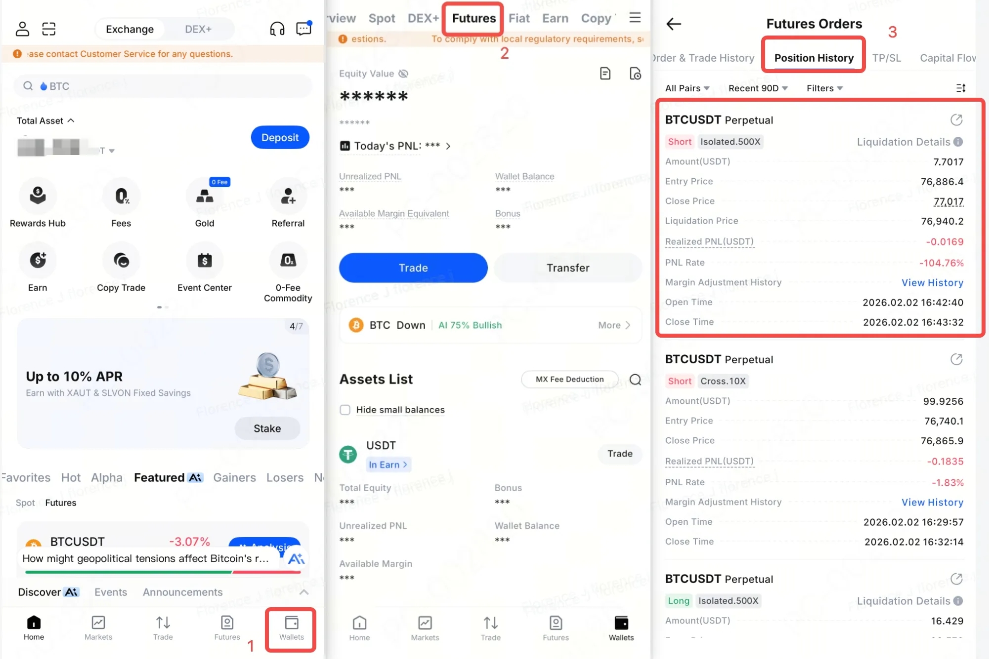3)Просмотрите свои ордера ликвидации в разделе История позиций.