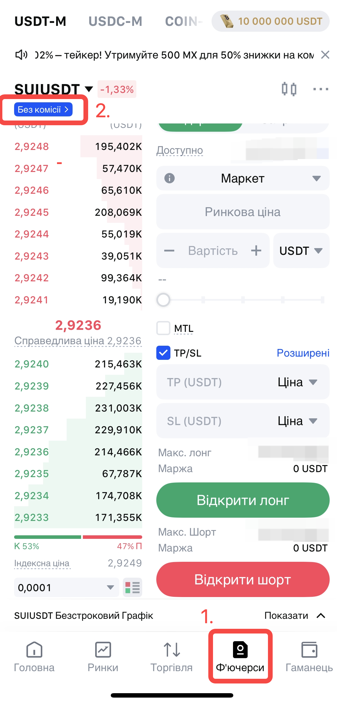 Торкніться Ф'ючерси в розділі меню і знайдіть ф'ючерсні пари BTC. Перевірте, чи є тег Без комісії прямо під торговою парою.