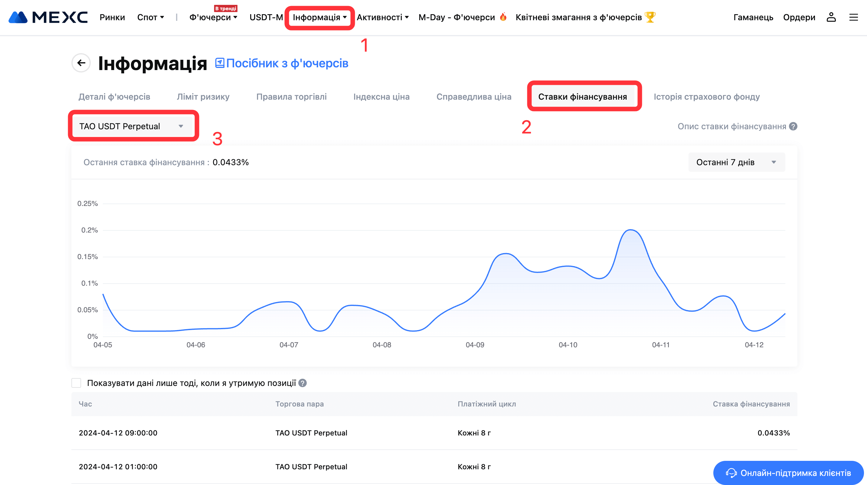Остання інформація про ставки фінансування наведена у вкладці Інформація - Ставки фінансування