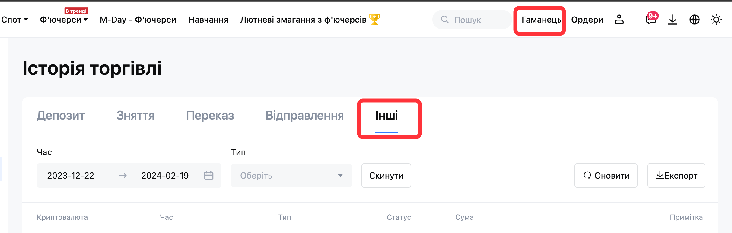 Увійдіть у свій акаунт MEXC - клацніть "Гаманець" - "Історія торгівлі" - "Інші".