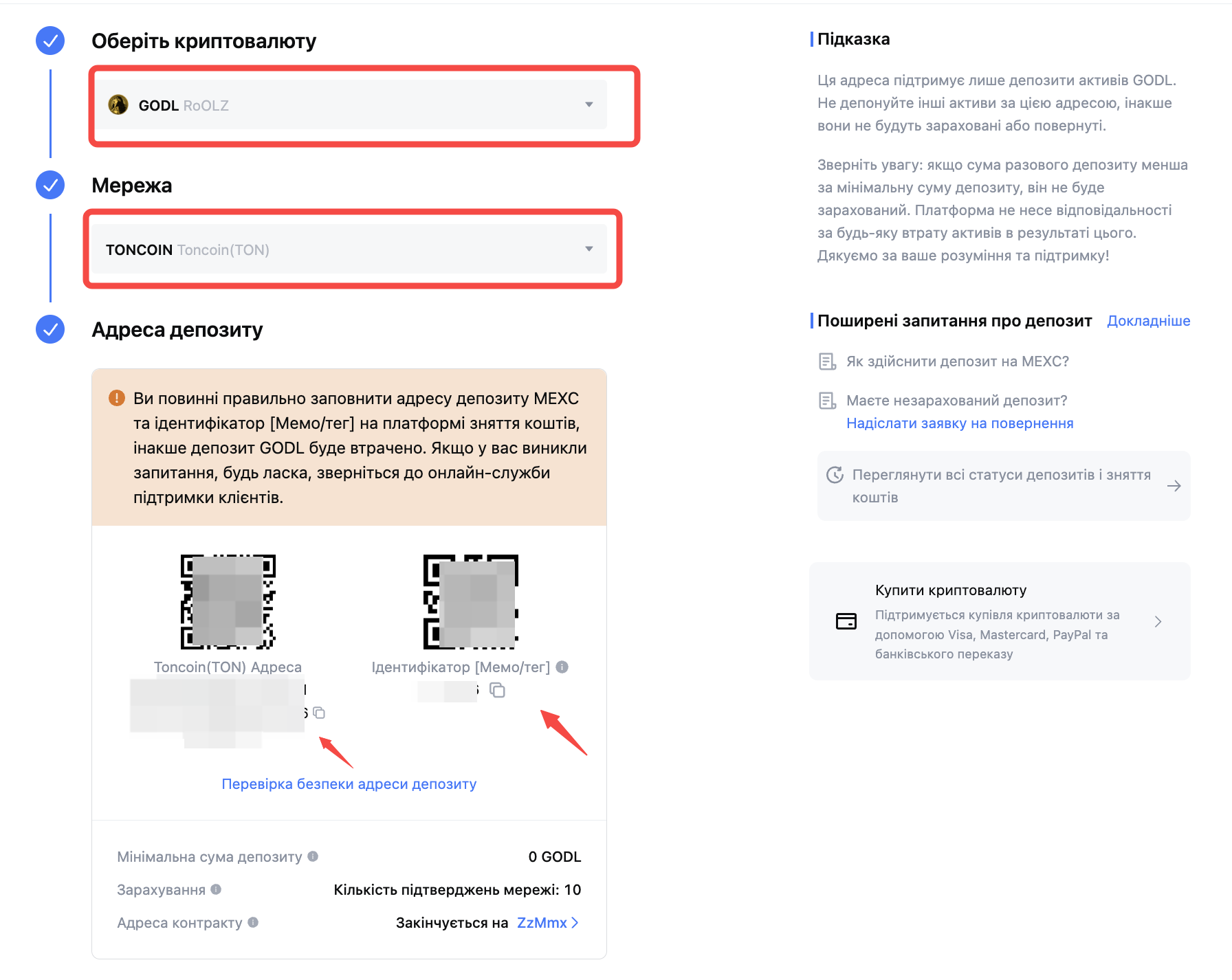 • Перейдіть в [Гаманець] > [Депозит] > [Оберіть криптовалюту - GODL] > [Мережа - TONCOIN] > Скопіюйте адресу депозиту і мемо.