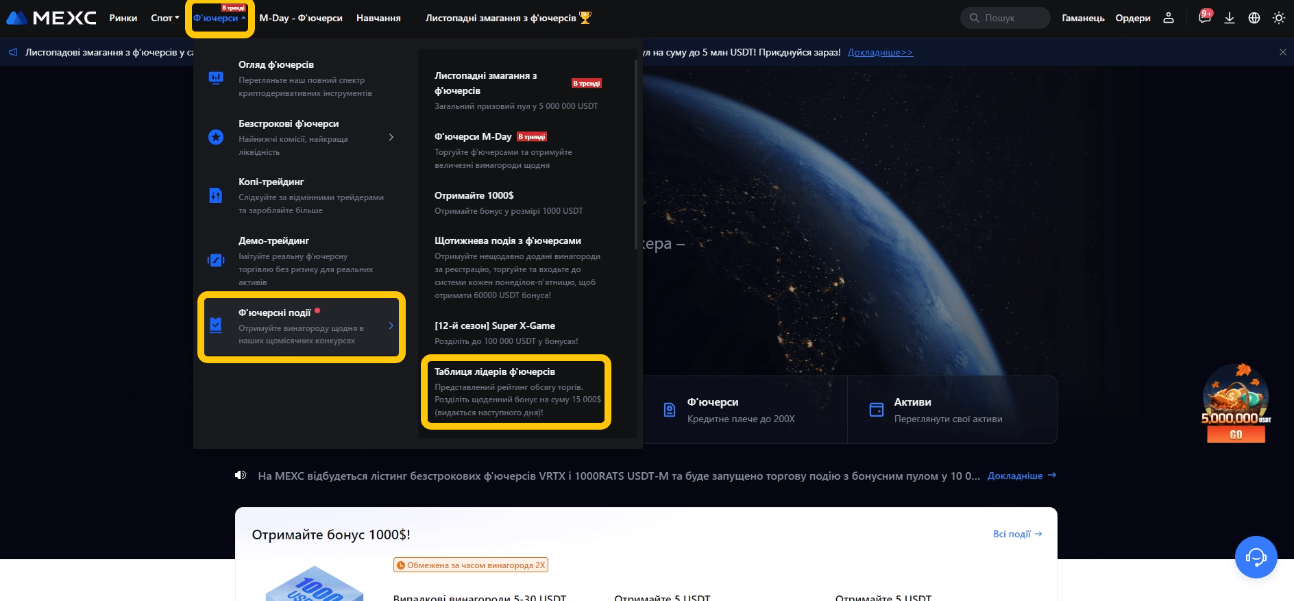 Вебсайт. Зайдіть на головну сторінку MEXC (https://www.mexc.com/uk-UA), клацніть [Ф'ючерси] у навігаційній панелі і виберіть [Таблиця лідерів ф'ючерсів].