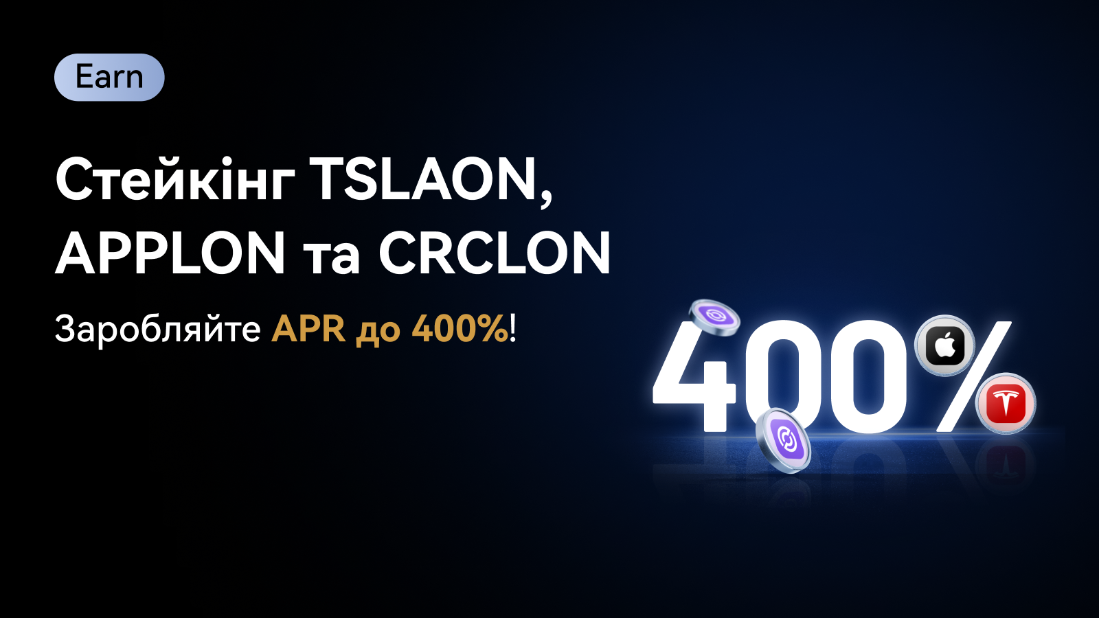 Найновіша подія з Грандіозного стейкінгу вже доступна — ексклюзивно для нових користувачів і протягом обмеженого часу. Стейкайте свої TSLAON, APPLON і CRCLON вже сьогодні, щоб заробити неймовірну APR у 400%. Не пропустіть цю рідкісну можливість!