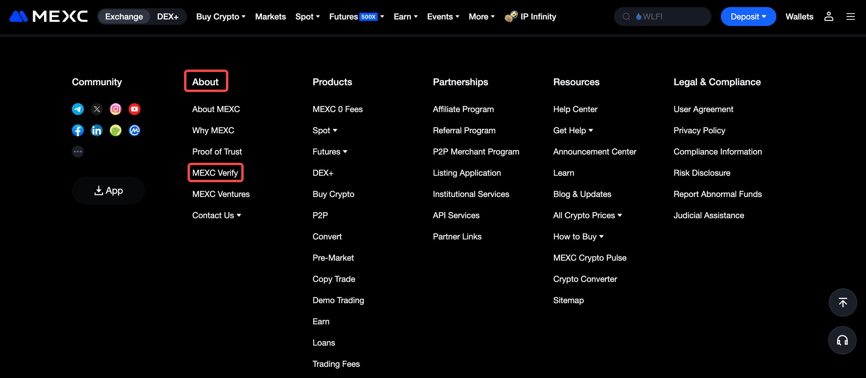 打開 MEXC 官方網站,滑動到官網首頁最下方,點擊【關於我們】下的【MEXC 官方驗證】進入驗證頁面。