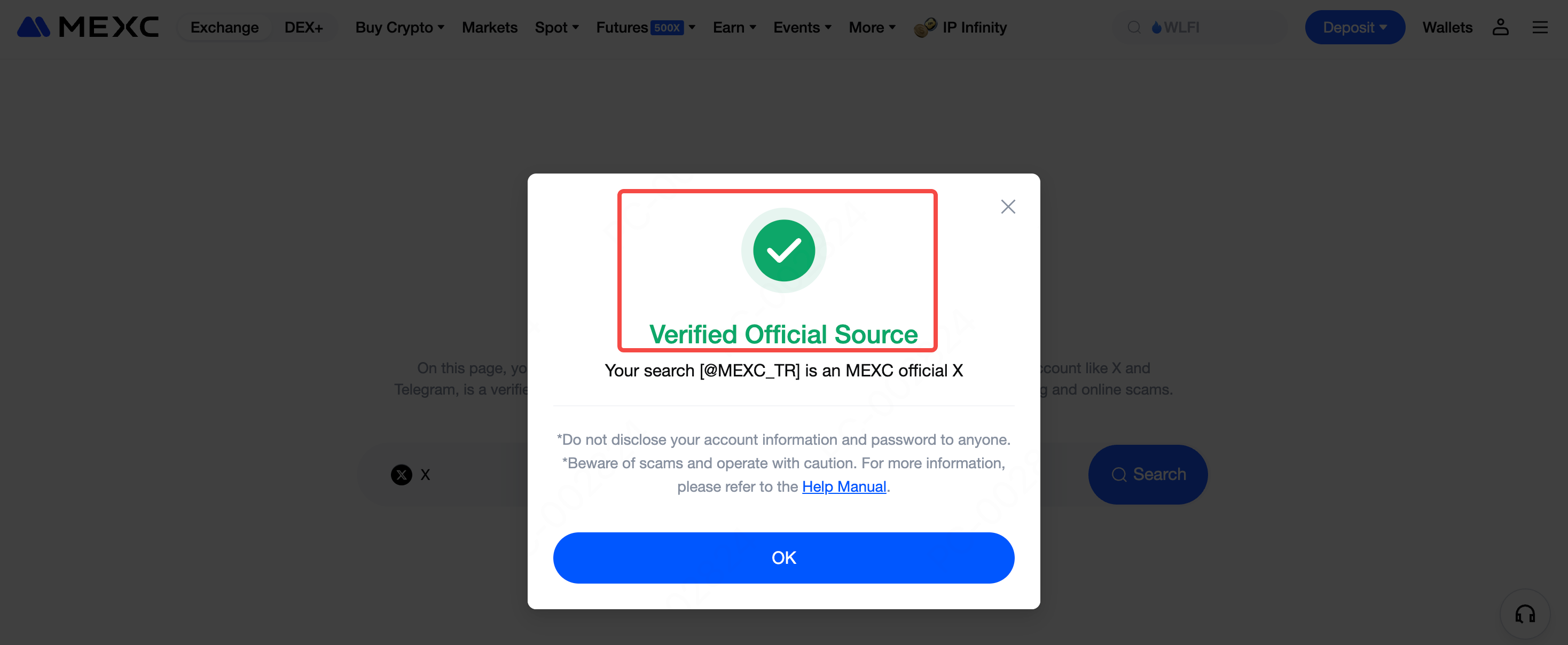 經查詢後確認為官方社媒,則會彈出綠色認證通過彈窗。如搜索 X 賬號 @MEXC_TR 結果如下圖所示。