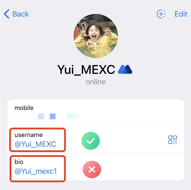 我們以 Telegram 賬號為例進行說明。如下圖所示,這是一個 MEXC 的官方賬號,該賬號的 ID 即 username 是 @Yui_MEXC 。建議用戶直接使用複製按鈕複製賬號,不要手動輸入賬號,以防釣魚賬號。