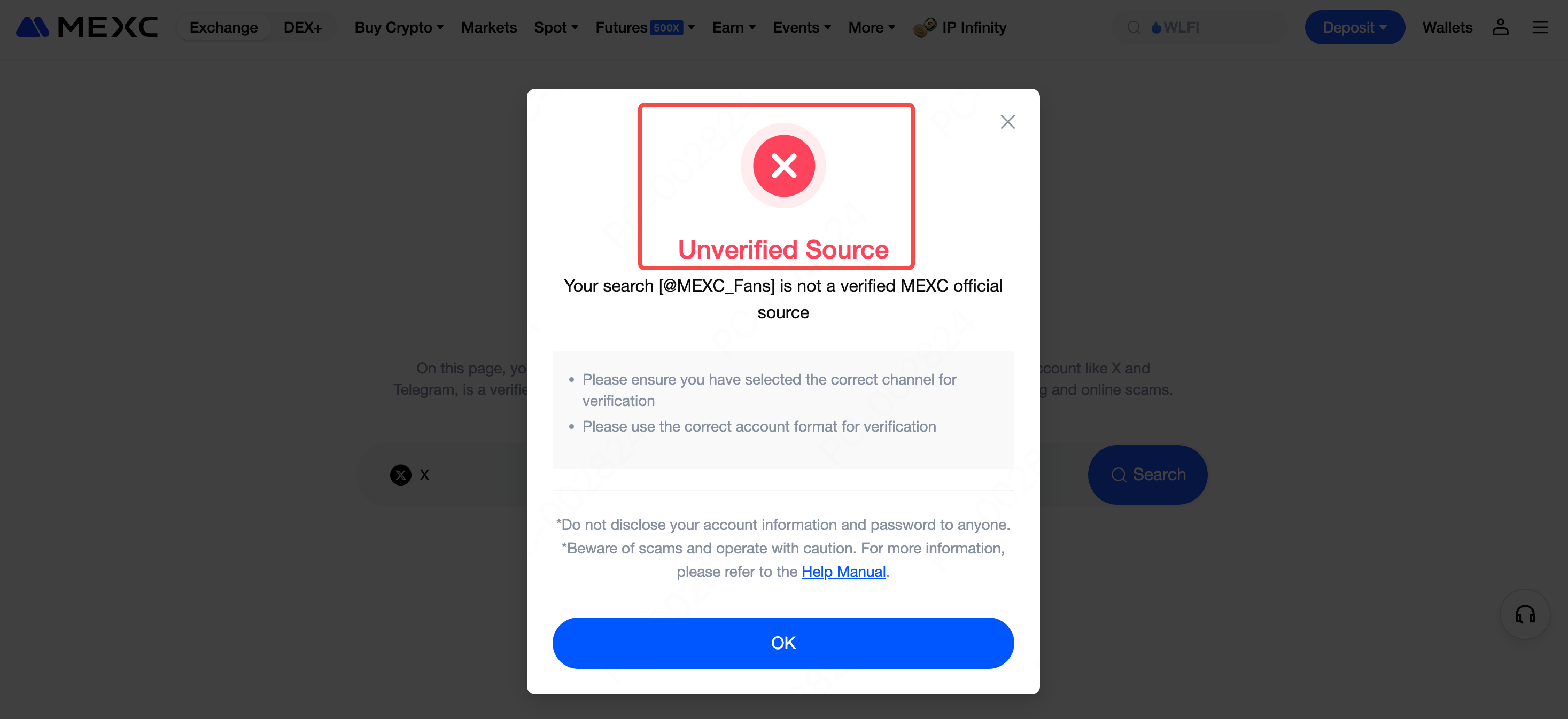 如果經查詢後確認為非官方社媒,則會彈出紅色認證不通過彈窗。如搜索 X 賬號 @MEXC_Fans 結果如下圖所示。這時您需要注意不要點擊其發布的相關鏈接,避免造成資產損失。