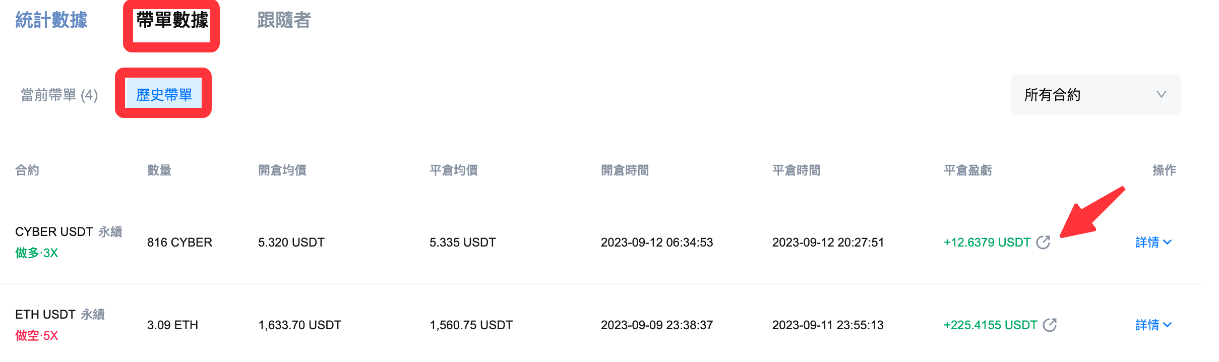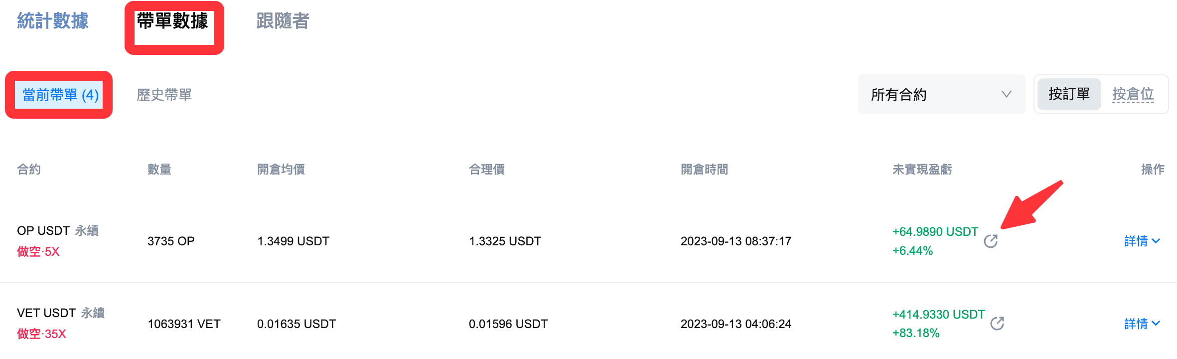 2.1 當前帶單盈虧數據分享(持倉中)