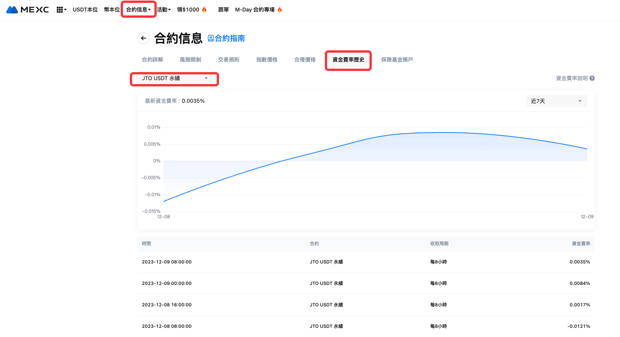 您可以通過“合約信息-資金費用歷史”了解最新的資金費率詳情。