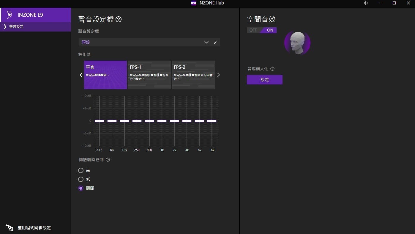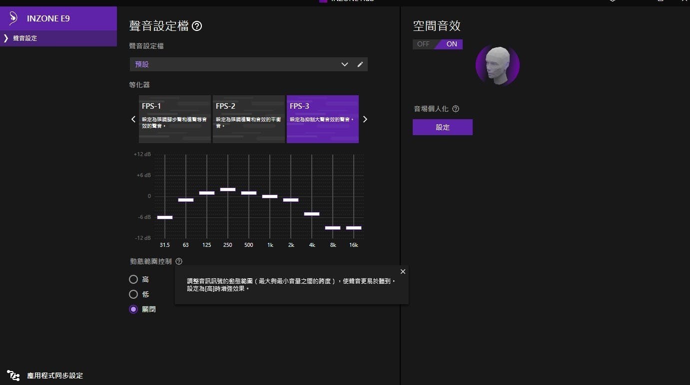 ▲由於INZONE E9沒有麥克風,INZOE Hub可調整的項目也不多▲內建三種針對FPS的預設調音,可依據遊戲類型與偏好選擇以及進一步個人化
