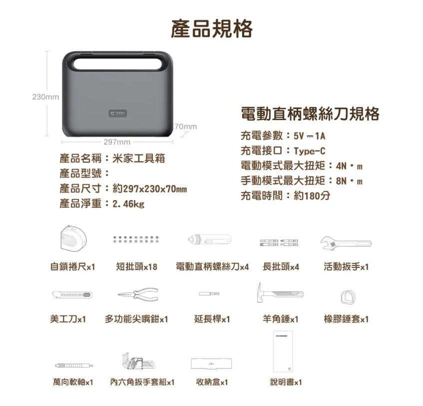 家中難免有水電大小事要處理,或者是修理單車、安裝汽車配件,每次手邊沒有順手的工具實在麻煩。小米這款米家工具箱整合了12種家庭常用的電動與手動工具,包括電動螺絲刀、捲尺、活動扳手、美工刀、尖嘴鉗、羊角錘、延長桿、內六角板手組、18個短批頭、4個長批頭、橡膠錘套、萬向軟軸,並且完美地收納在隨附的手提工具箱內。這些工具足以應家中難免有水電大小事要處理,或者是修理單車、安裝汽車配件,每次手邊沒有順手的工具實在麻煩。小米這款米家工具箱整合了12種家庭常用的電動與手動工具,包括電動螺絲刀、捲尺、活動扳手、美工刀、尖嘴鉗、羊角錘、延長桿、內六角板手組、18個短批頭、4個長批頭、橡膠錘套、萬向軟軸,並且完美地收納在隨附的手提工具箱內。這些工具足以應