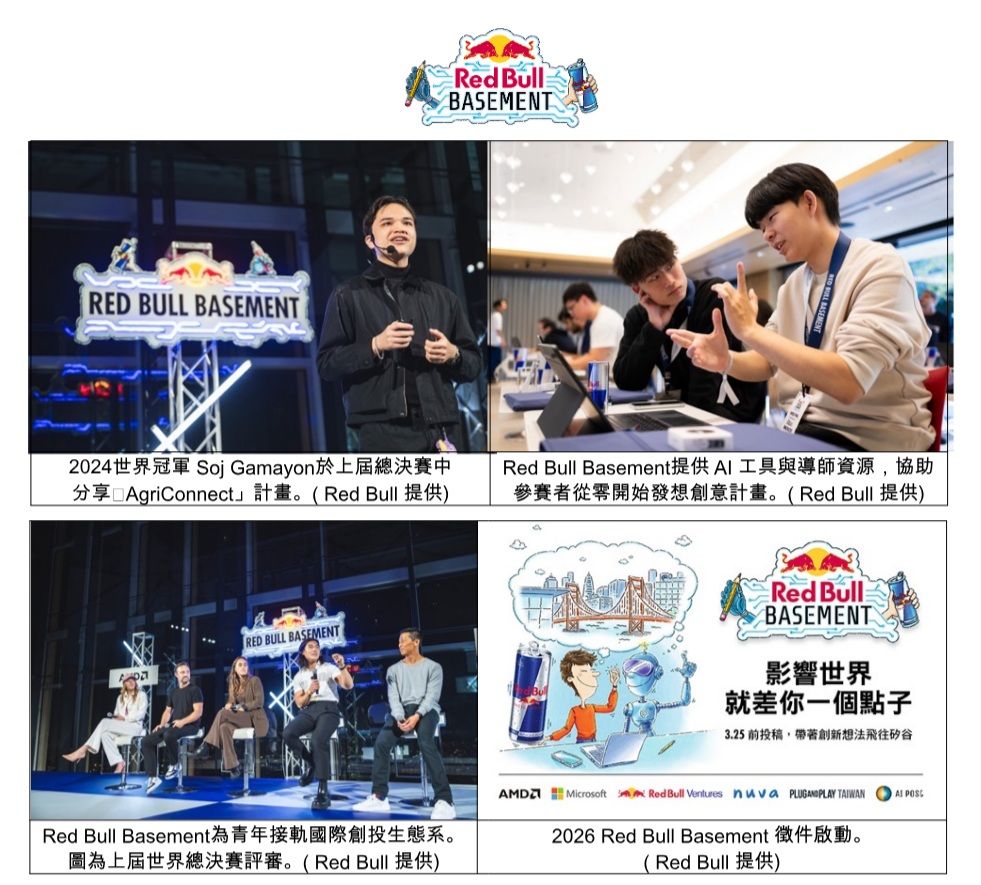 2026 Red Bull Basement創意孵化計畫徵件開跑,即日起至2026年3月25日止,Red Bull號召台灣年滿18歲青年把腦中對新創創新的想像以AI化為具體解決方案投稿,並透過官方AI工具與微軟、AMD的AI技術做為後盾,台灣獲勝隊伍將與其它全球頂尖團隊角逐10萬美金創業基金,同時各國決勝優選隊伍將與全球頂尖評審、創業投資人及產業領袖組成的專業評審團展示最小可行性產品,包括史丹佛大學、Red Bull Ventures也會參與計畫,協助獲獎者拉近與產學的距離與資源。