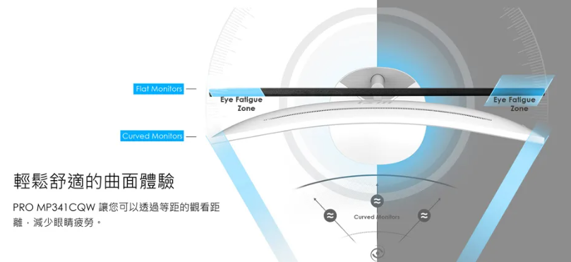 ▲1500R的曲度設計讓你維持視距瀏覽,減輕視覺的負擔。